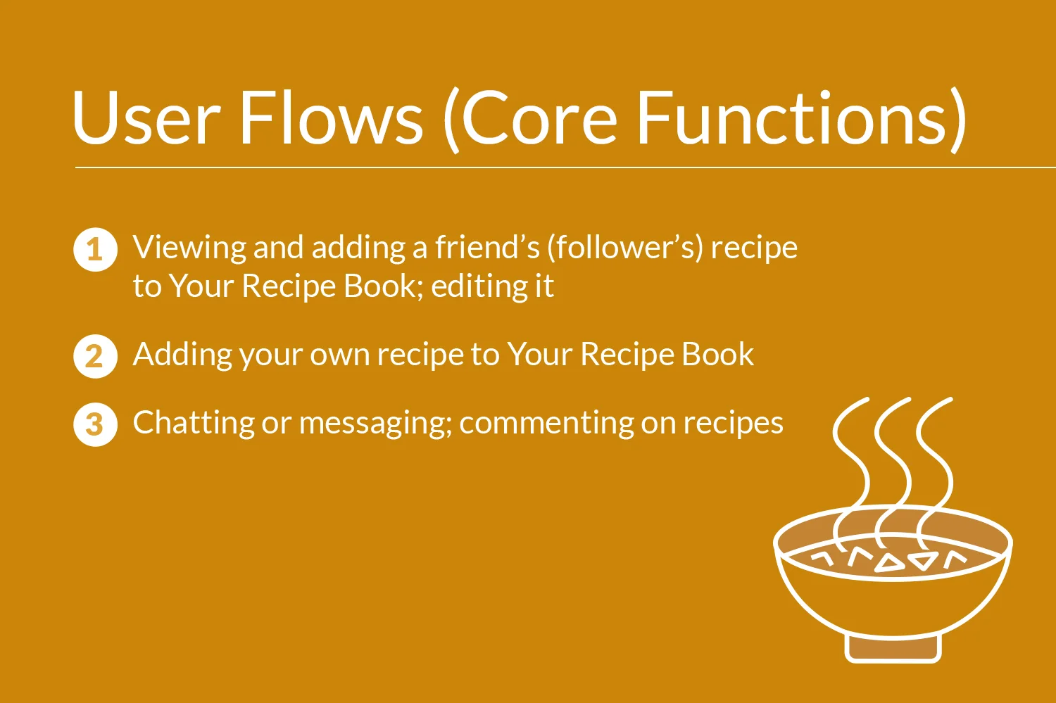 Prototype.    1.  Main screen with user's feed composed of recipes posted to the app by friends.   2.  View of user's recipe book with recipes from feed or user's own recipes. Filtering feature shown.   3.  View of recipe in editing