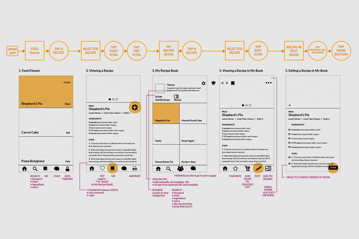 Diagram of user flow no. 1 (viewing a recipe in your feed; adding it to your recipe book; and editing it). The corresponding wireframes with highlighted actions are below.